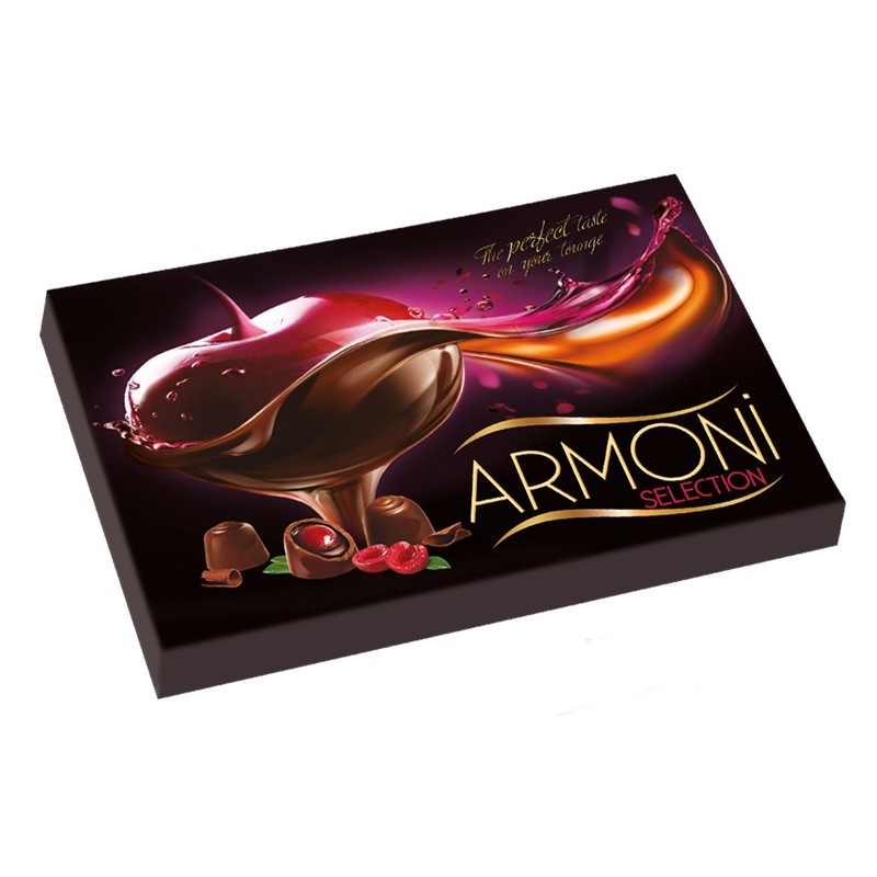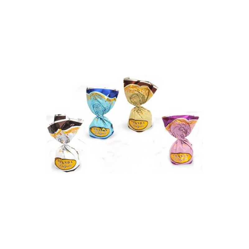 Směs čokoládových pralinek Amanda s krémovou náplní s oříškovou, kokosovou, karamelovou, jahodovou, pomerančovou a banánovou chutí.
