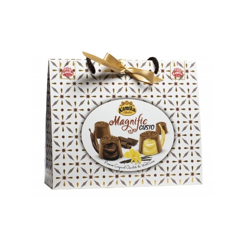 Plněné pralinky v originálním balení ve stylu kabelky s dekorem a saténovou stužkou.