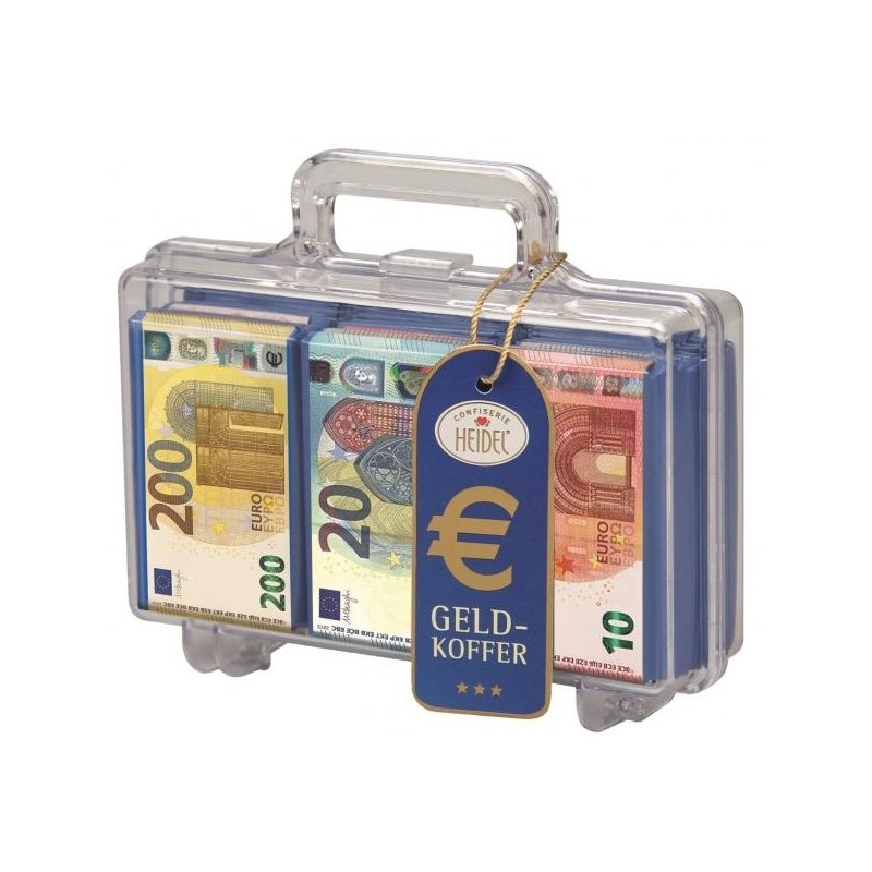 Dárková plastová krabička ve tvaru kufříku (12x10x3cm) s jemnou mléčnou čokoládou (15ks) s potiskem eurobankovek.