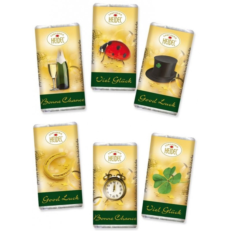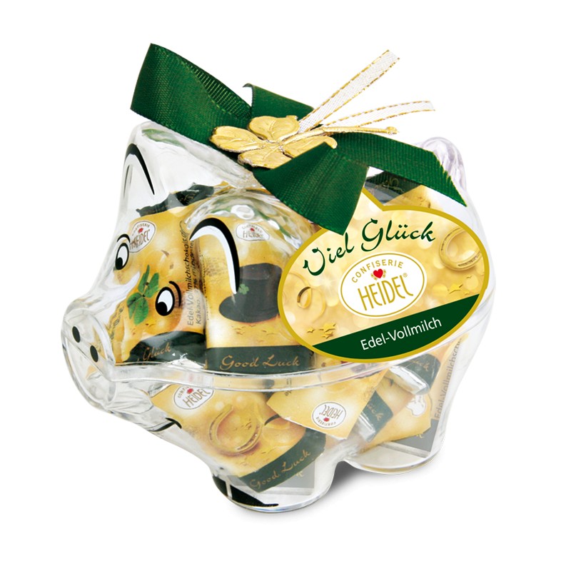 Uvnitř pokladničky 20 malých čokoládek z jemné mléčné čokolády (37% kakaa) se symboly štěstí.