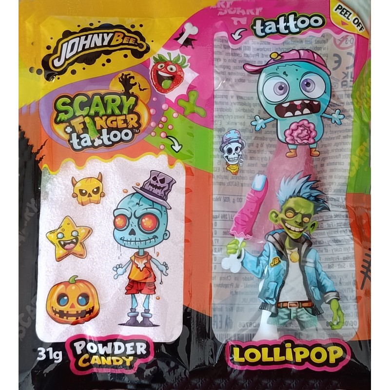 Ovocné lízátko prst se stylovou hůlkou ve tvaru kosti a spousta skvělého prášku k namáčení.