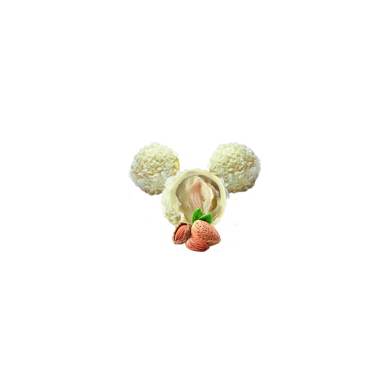 Lanýže z bílé čokolády se smetanovým krémem a celou mandlí bohatě sypané kokosem.