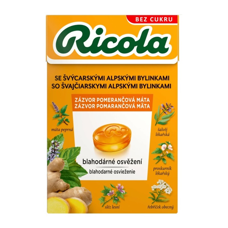 Bylinné bonbóny s intenzivní chutí pomerančů, osvěžující mátou, zázvorem a s výtažkem 13 osvědčených švýcarských alpských bylinek.