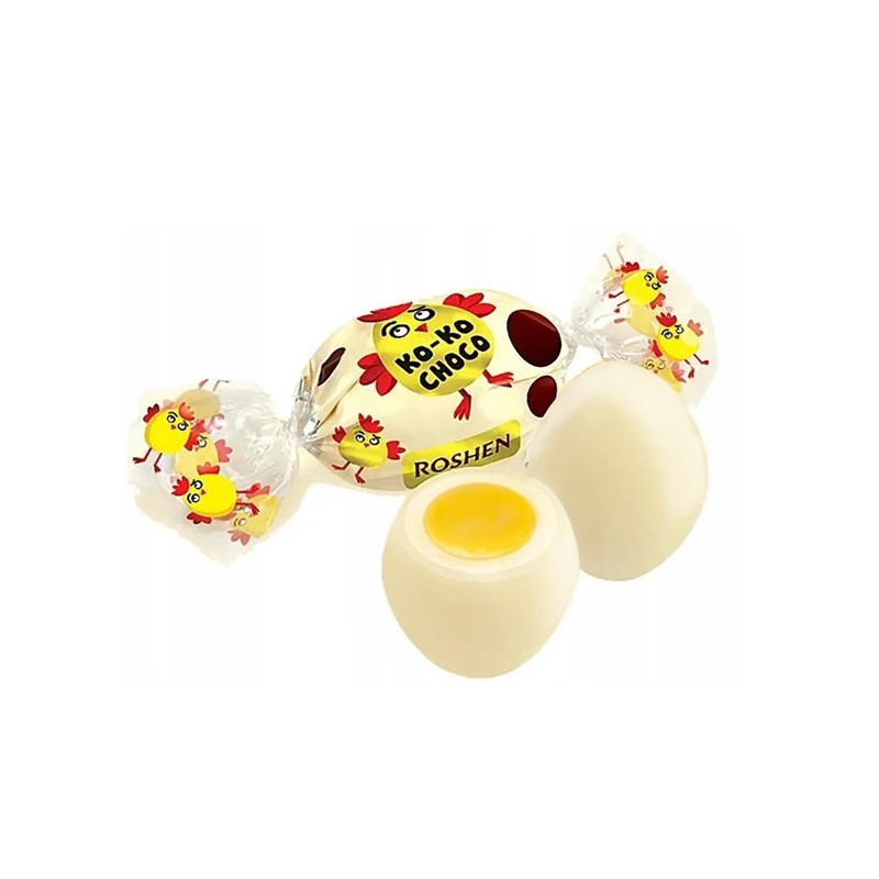 Glazované bonbony z bílé čokolády s dvojitou náplní.