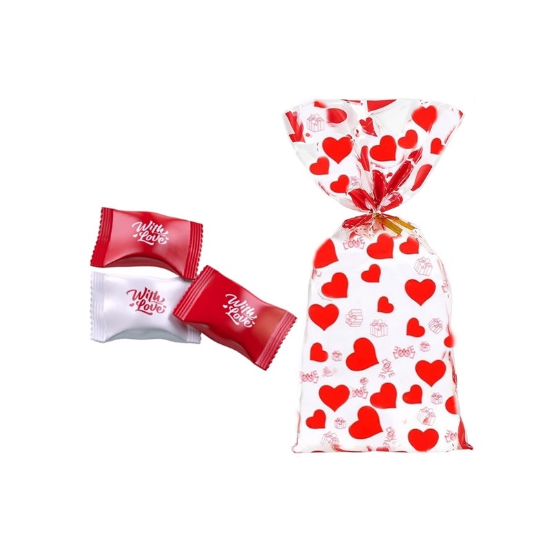 Dárkové balení v průhledném celofánovém sáčku se srdíčkovým potiskem.